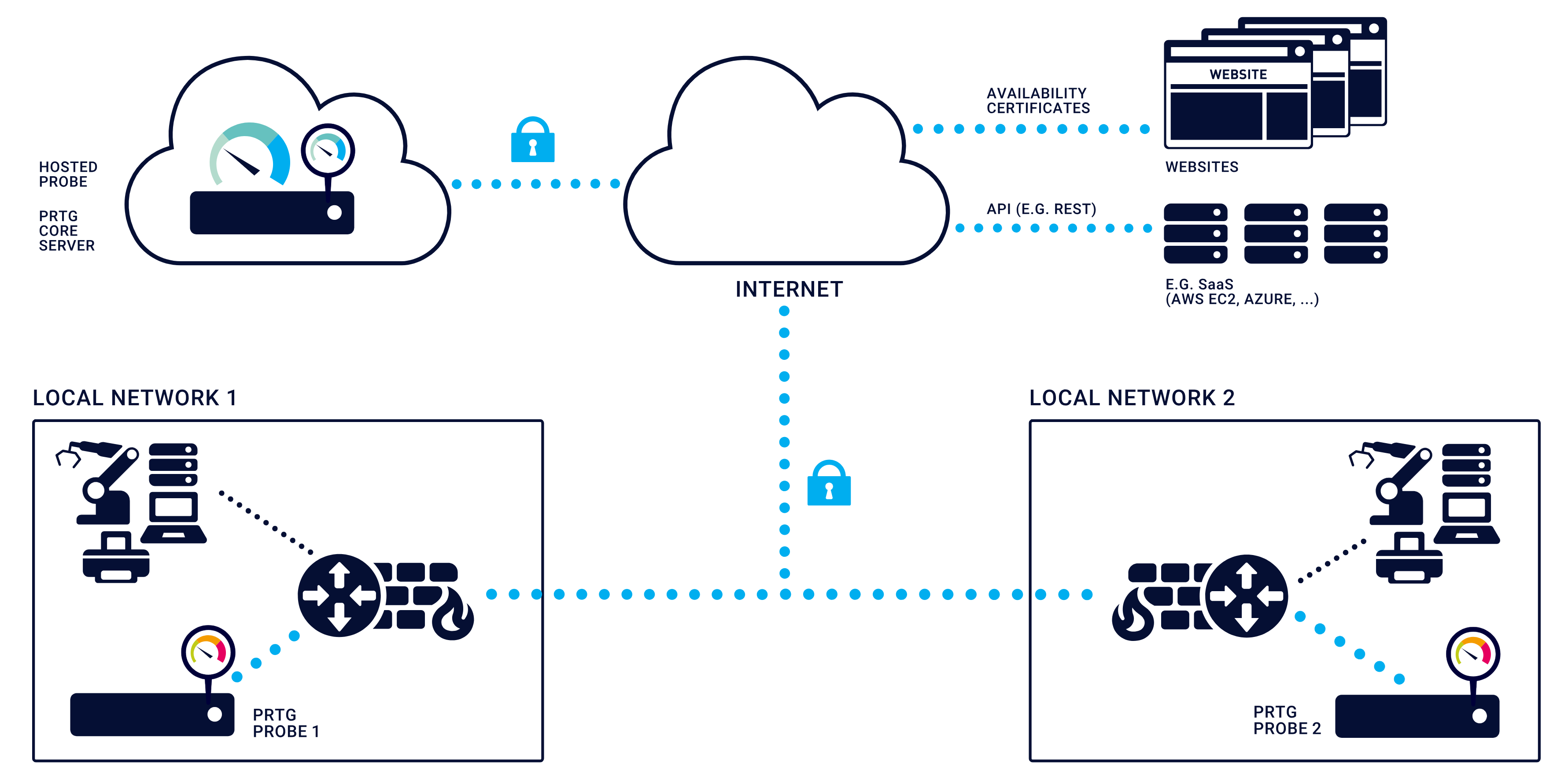 You can create additional remote probes to monitor multiple locations, to monitor a LAN with PRTG Hosted Monitor, or for several other scenarios. Remote probes use SSL/TLS-secured connections to the PRTG core server. With remote probes, you can securely monitor services and systems inside remote networks that are not publicly available or that are secured by firewalls.